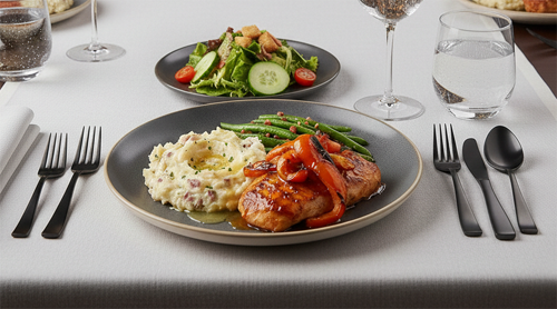 Roasted Sweet Pepper Chicken, Redskin Mashed Potatoes, Country Style Green Beans, House Salad & Dessert