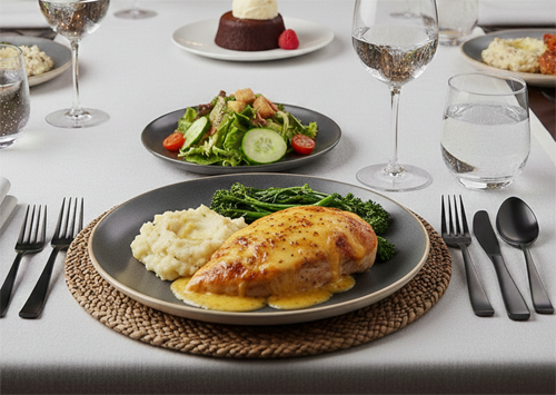 Creamy Parmesan Baked Chicken, White Cheddar Mashed Potatoes, Broccolini, House Salad & Dessert